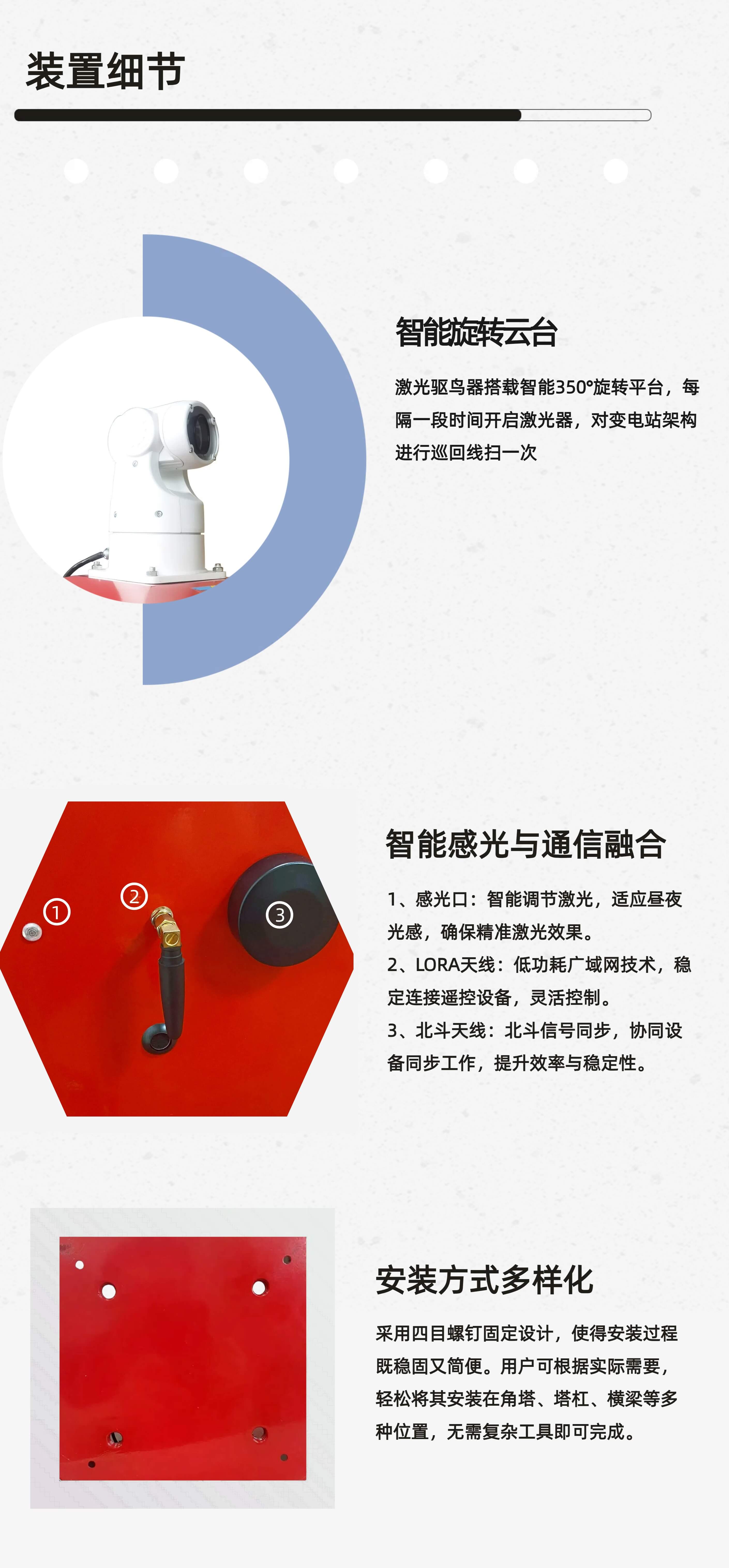 激光驅(qū)鳥器是我公司針對(duì)變電站安全防護(hù)專門研發(fā)的一套驅(qū)鳥設(shè)備,通過發(fā)出對(duì)鳥類視覺最為敏感的520nm綠色激光從而達(dá)到驅(qū)鳥目的。設(shè)備全程自動(dòng)運(yùn)行,為變電站的安全運(yùn)行提供有力保障。