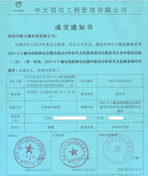 依據(jù)評(píng)審小組評(píng)審意見及推薦,經(jīng)公示無異議,確定我司為包頭供電公司2023-5-5輸電線路舞動(dòng)及微風(fēng)振動(dòng)分析研究及監(jiān)測(cè)系統(tǒng)應(yīng)用服務(wù)項(xiàng)目競(jìng)爭(zhēng)磋商采購(二次) (第一標(biāo)段: 2023-5-5 輸電線路舞動(dòng)及微風(fēng)振動(dòng)分析研究及監(jiān)測(cè)系統(tǒng)應(yīng)用服務(wù))的成交人,具體內(nèi)容如下: