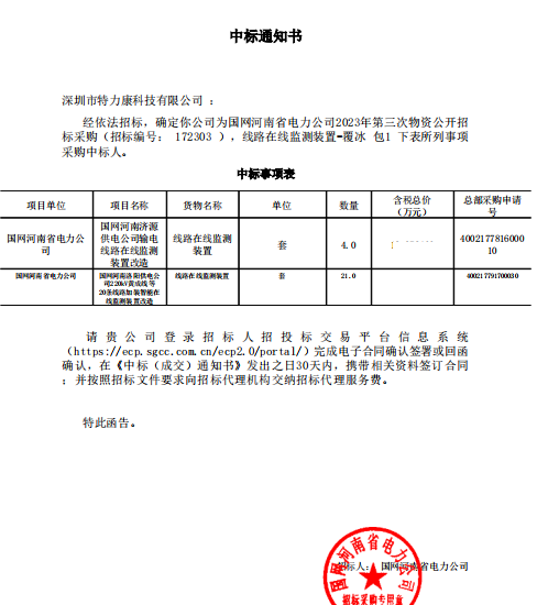 特力康中標國網黑龍江送變電工程公司的2024年度第18次物資類競爭性談判采購項目——慶陽驅鳥器物資框 特力康中標國網甘肅省電力公司省管產業單位2024年第五次物資競爭性談判授權采購項目 中標喜訊:深圳市特力康科技有限公司成功入圍許繼集團綜合能源公司輸電線路視頻在線監測裝置模塊集采項目 中標喜訊:特力康成功中標國網重慶市電力公司渝中一片區項目 特力康成功中標國網天津市電力公司2024年第二次?物?資招標項目 特力康中標國網安徽省電力有限公司蕪湖供電公司2024年3月非物質采購項目 特力康輸電線路智能AI多目監控裝置+傾斜監測守護山西輸電生命線 鄂網“全景眼”:特力康一體化視頻監控系統守護輸電線路 山東電網 “穩塔哨兵”:特力康智能桿塔傾斜監測預警裝置筑牢電力桿塔安全防線 特力康科技輸電線路高清圖像監控裝置,為河南輸電通道筑牢安全屏障 黃土高原護塔穩:特力康傾斜監測裝置為山西電網筑牢根基 黔山冰防線:特力康 “數據 + 圖像” 雙監測守護貴州輸電線路 戈壁林區的 “火情哨兵”:特力康紅外熱成像裝置守護甘肅輸電線路 內蒙電網裝上 “舞動監測眼”:特力康輸電線路防舞動監測系統守護線路安全 寧夏配電線路安裝了我司防外破電子化智能警示牌