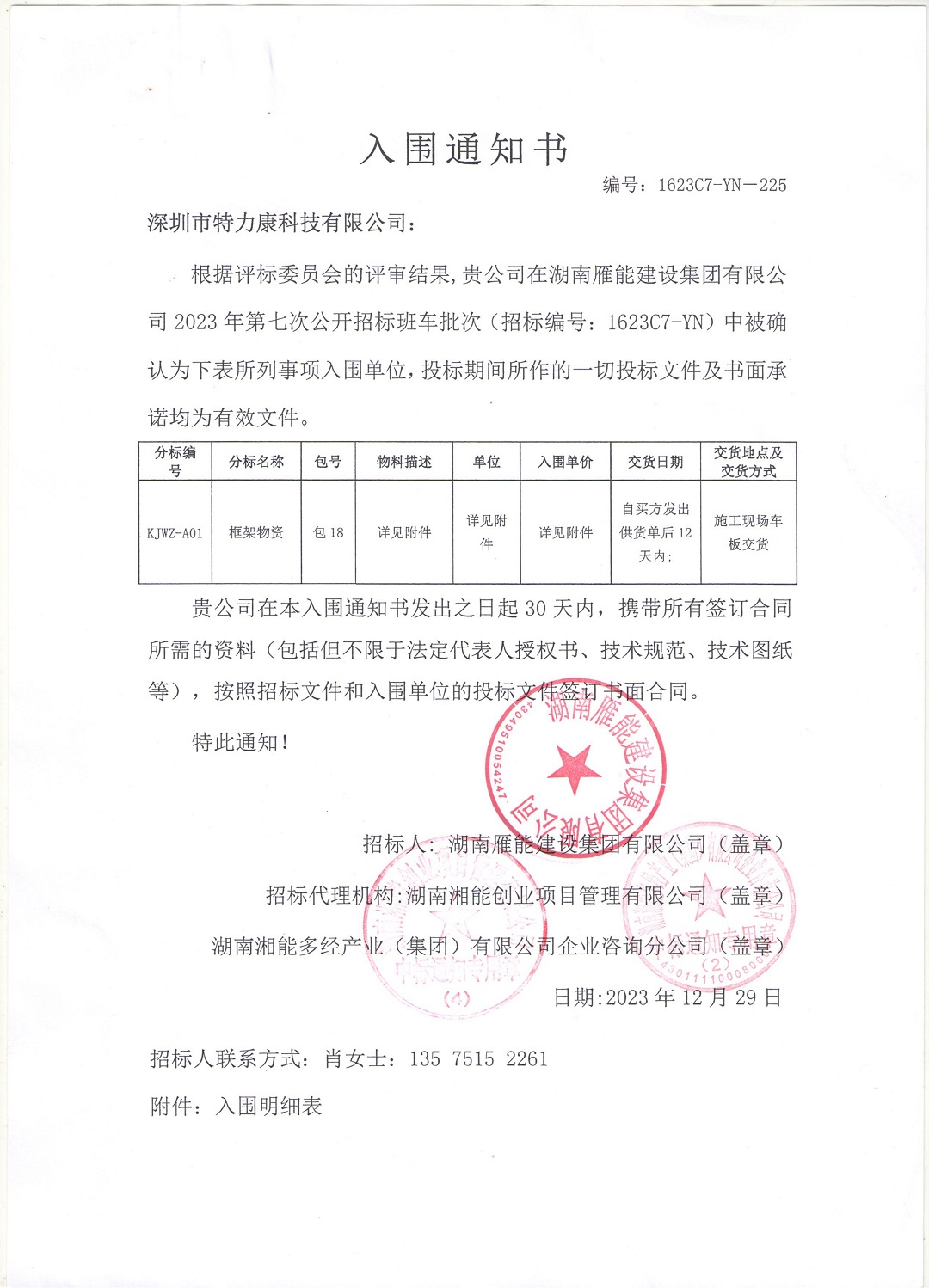 根據(jù)評標委員會的評審結(jié)果,我司在湖南雁能建設(shè)集團有限公司2023年第七次公開招標班車批次(招標編號:1623C7-YN)中表現(xiàn)出色,經(jīng)過嚴格評審,我司被確認為本次招標項目的入圍單位。