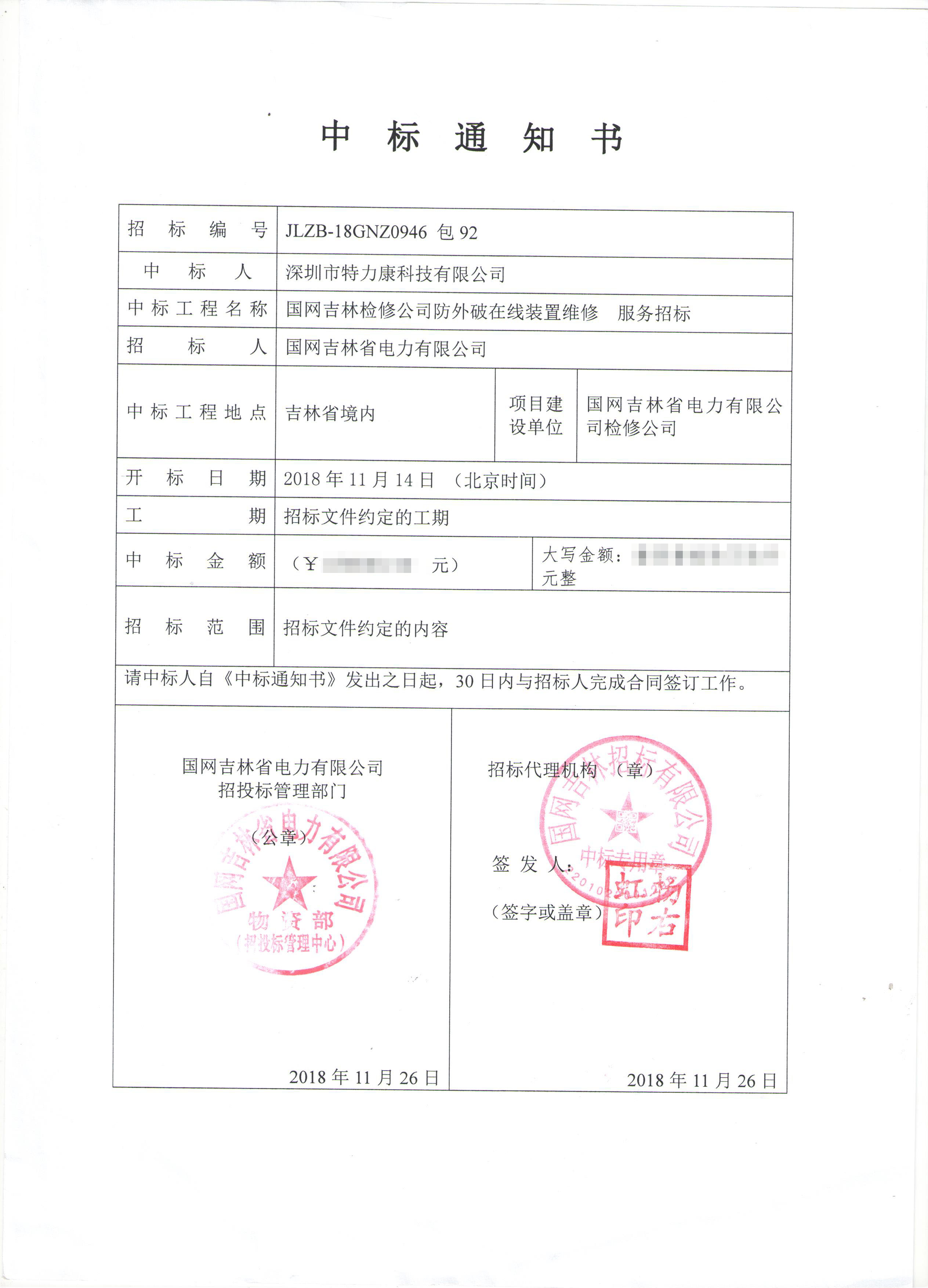 國網吉林省電力公司防外破裝置項目采購項目評審工作已結束,經評審委員會評審,經國網吉林省電力公司招投標領導小組批準,將評審結果公示。我司被確定為中標單位現將公告公示。