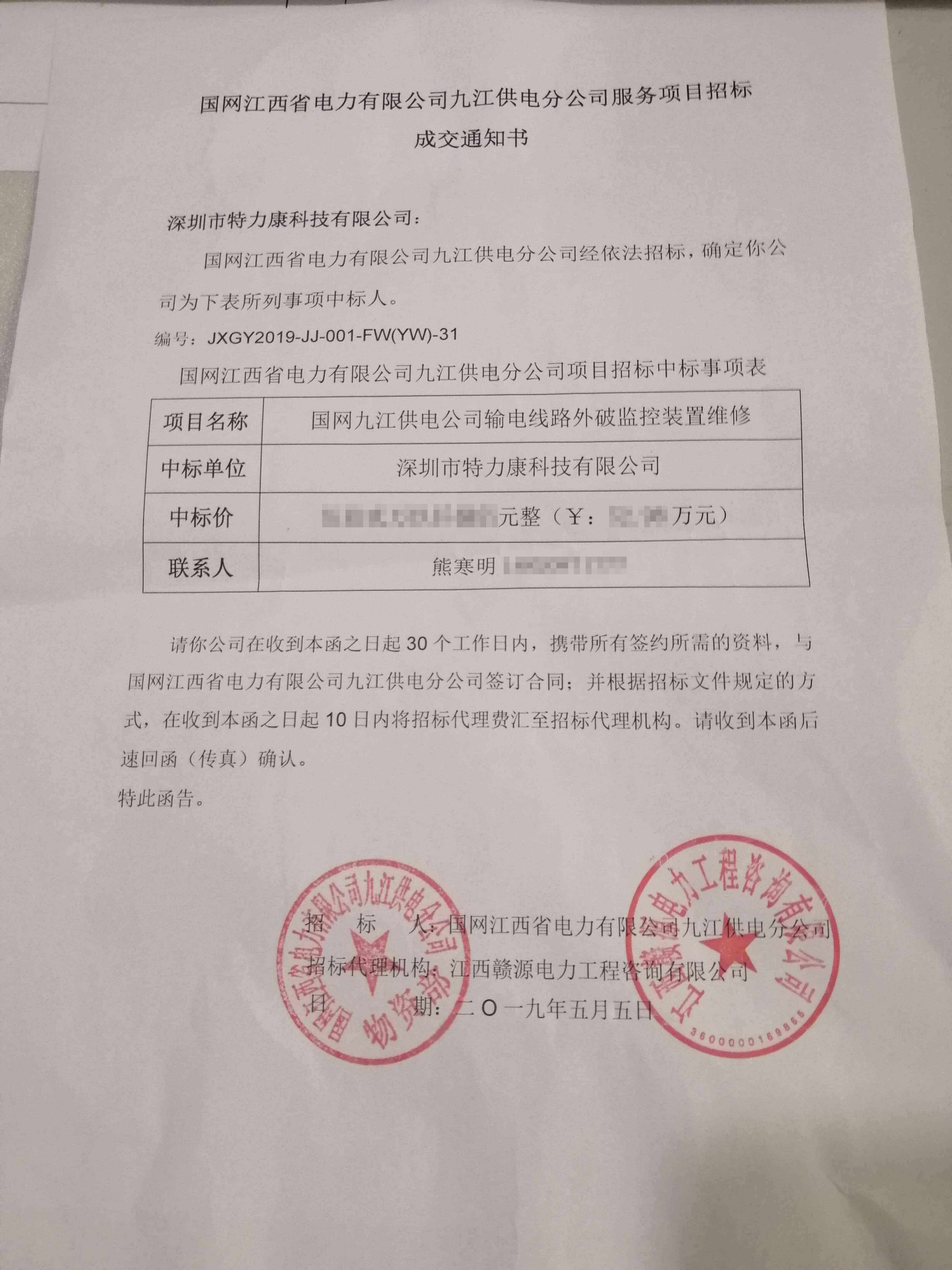 國網(wǎng)江西九江供電有限公司輸電線路防外破監(jiān)控裝置采購項目評審工作已結(jié)束,經(jīng)評審委員會評審,經(jīng)國網(wǎng)江西九江供電有限公司招投標領(lǐng)導(dǎo)小組批準,我司被確定為此次輸電線路防外破監(jiān)控裝置采購項目中標單位現(xiàn)將公告公示。