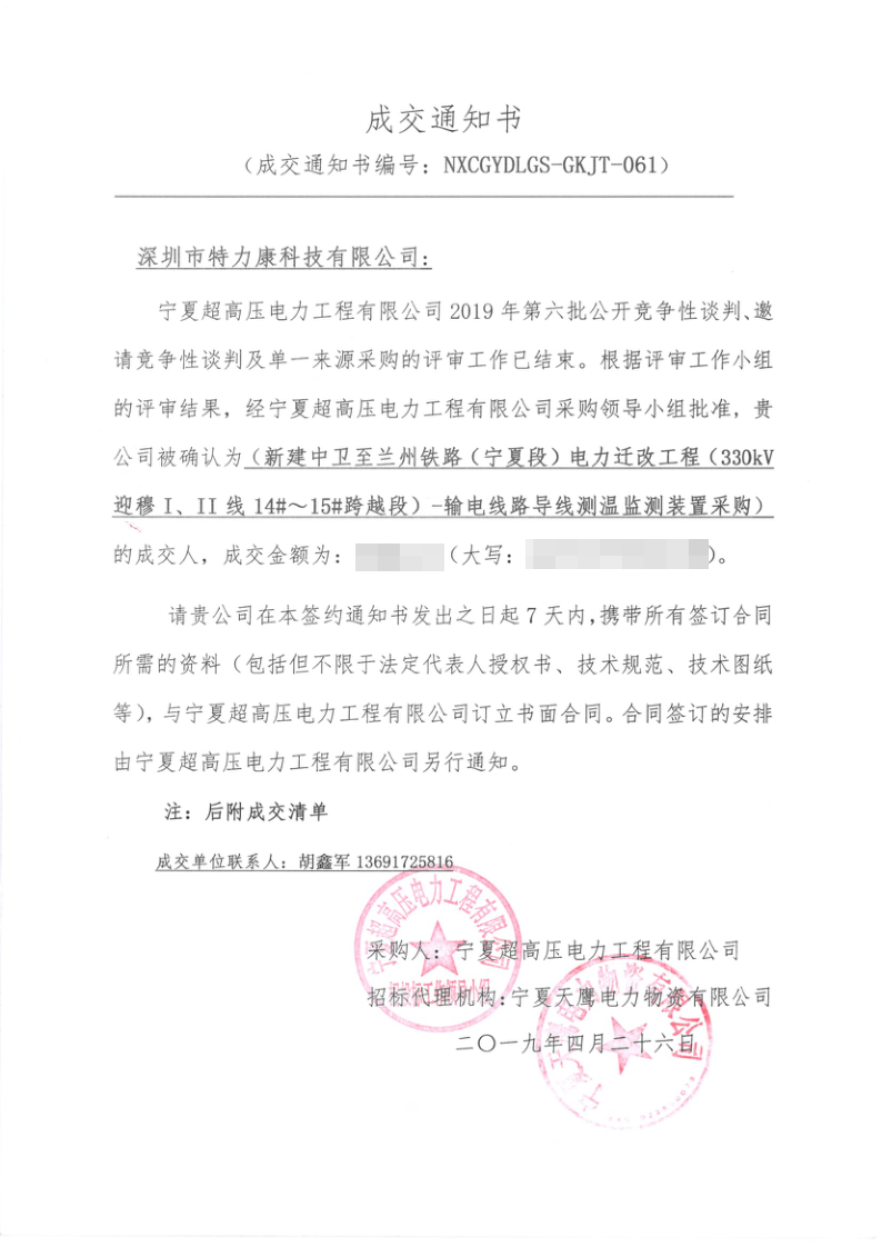 寧夏超高壓局2019年第六批公開競(jìng)爭(zhēng)性談判電力遷改項(xiàng)目評(píng)審工作已結(jié)束,經(jīng)評(píng)審委員會(huì)評(píng)審,經(jīng)寧夏超高壓局招投標(biāo)領(lǐng)導(dǎo)小組批準(zhǔn),我司被確定為此項(xiàng)目簽約單位現(xiàn)將公告公示。