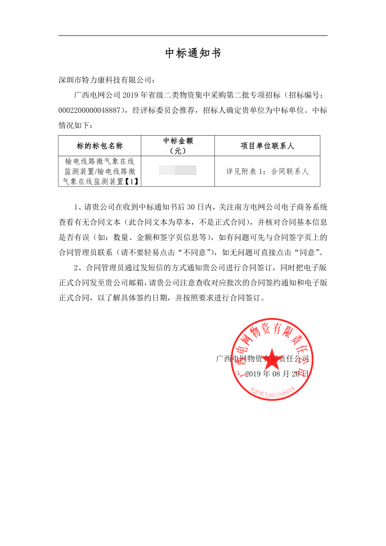廣西電網(wǎng)公司 2019 年省級(jí)二類物資集中采購第二批專項(xiàng)招標(biāo)項(xiàng)目評(píng)審工作已結(jié)束,經(jīng)評(píng)標(biāo)委員會(huì)推薦,招標(biāo)人確定我司為中標(biāo)單位。