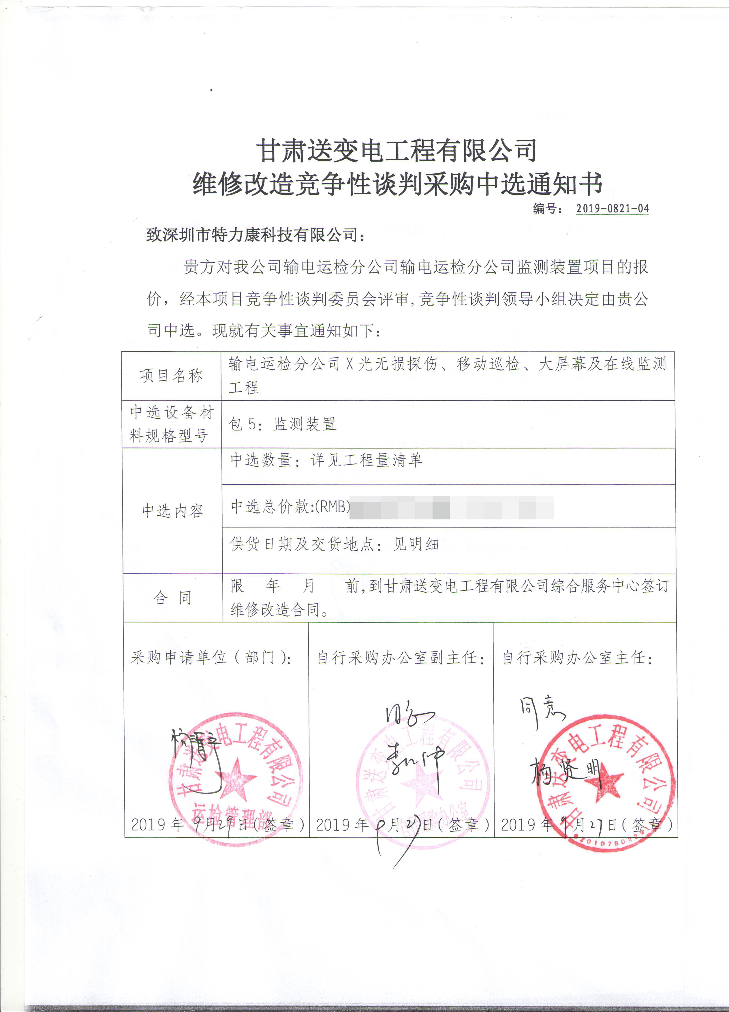 經(jīng)審委員會根據(jù)招標程標次評審、對有效標書認真評審,競爭性談判領(lǐng)導(dǎo)小組確定我司為甘肅送變電工程有限公司維修改造競爭性談判采購項目中標單位。