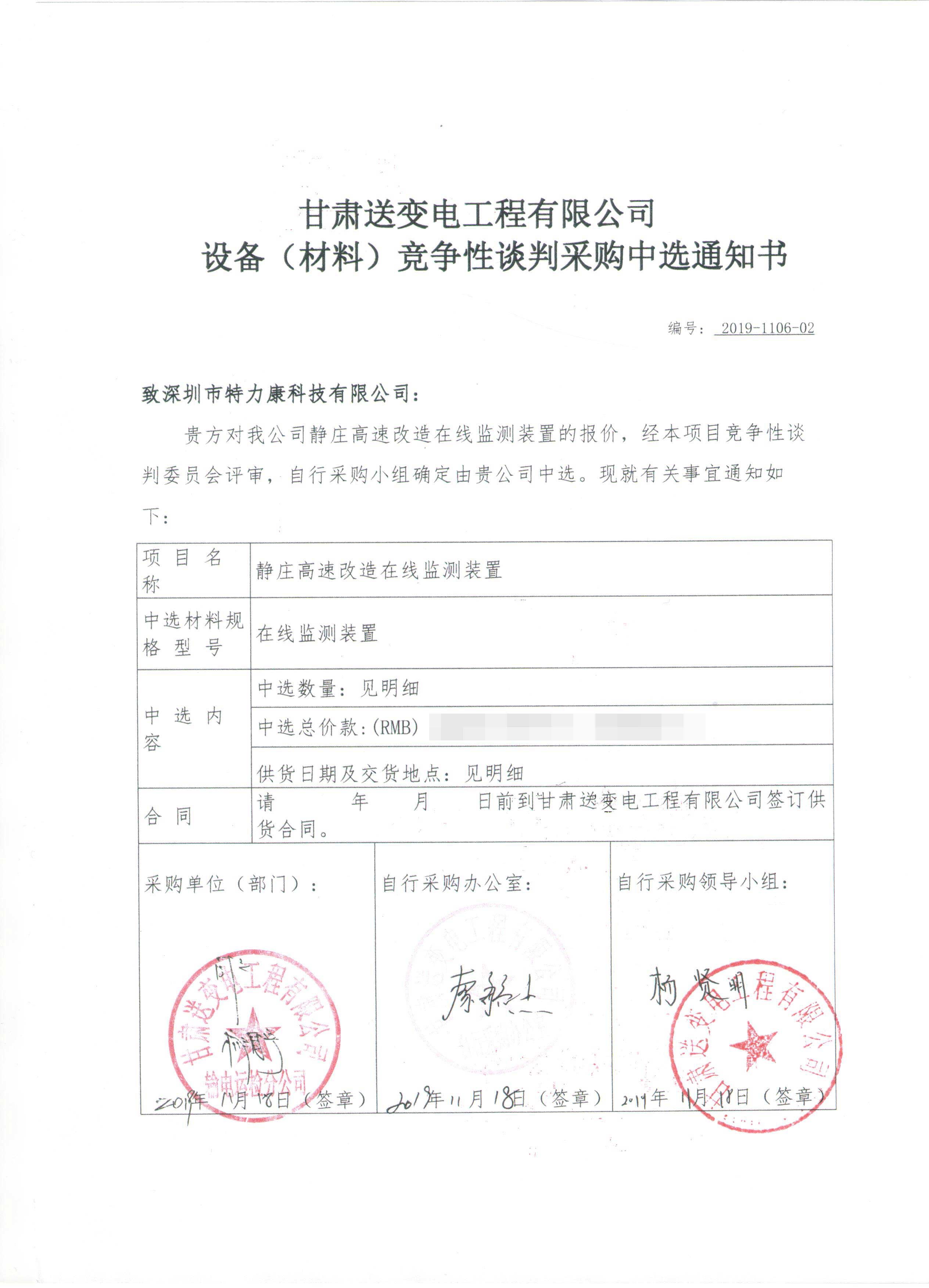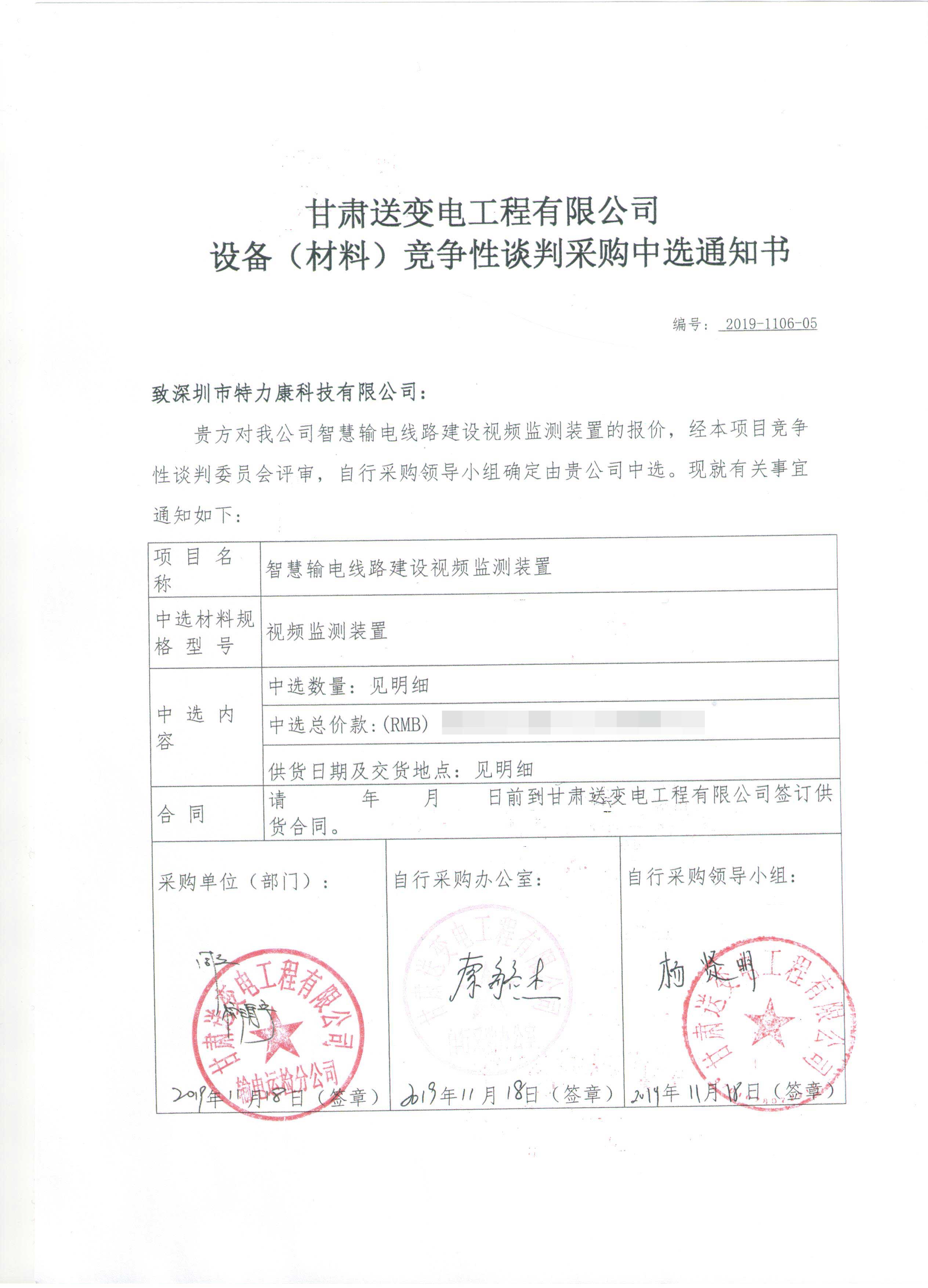 甘肅送變電工程有限公司智慧輸電線路建設(shè)視頻監(jiān)測裝置及靜莊高速改造在線監(jiān)測裝置競爭性談判采購工作已經(jīng)結(jié)束,根據(jù)評審委員會評審結(jié)果,招投標領(lǐng)導小組批準,確定此次甘肅送變電工程有限公司智慧輸電線路建設(shè)視頻監(jiān)測裝置及靜莊高速改造在線監(jiān)測裝置競爭性談判采購由我司深圳市特力康科技有限公司中標,現(xiàn)將公告示下: