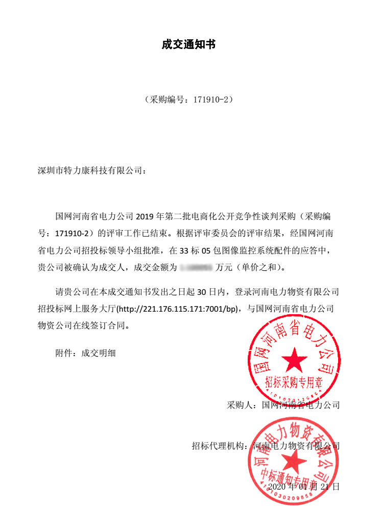 國(guó)網(wǎng)河南省電力公司2019年第二批電商化公開競(jìng)爭(zhēng)性談判采購(gòu)(采購(gòu)編號(hào): 171910-2) 談判工作已結(jié)束,經(jīng)評(píng)審委員會(huì)評(píng)審,并報(bào)公司招投標(biāo)工作領(lǐng)導(dǎo)小組批準(zhǔn),我司中標(biāo)國(guó)網(wǎng)河南省電力公司2019年第二批電商化公開競(jìng)爭(zhēng)性談判采購(gòu)33標(biāo)05包圖像監(jiān)控系統(tǒng)配件及34標(biāo)03包圖像監(jiān)控系統(tǒng)接口板,中標(biāo)通知如下: