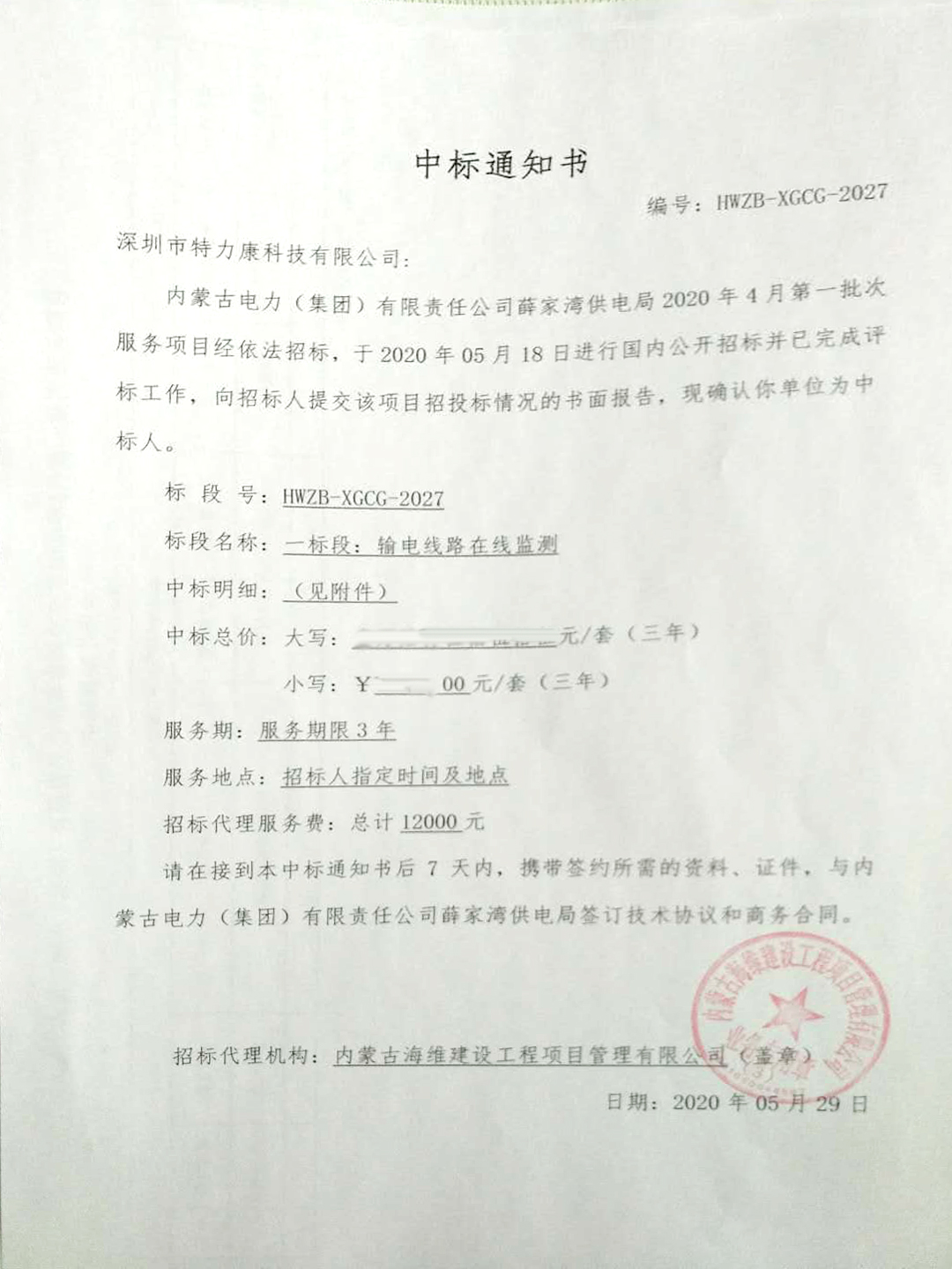 內(nèi)蒙古電力(集團(tuán))有限責(zé)任公司薛家灣供電局2020年4月第一批次服務(wù)項(xiàng)目(一標(biāo)段:輸電線路在線監(jiān)測(cè))經(jīng)依法招標(biāo),于2020年05月18日進(jìn)行國(guó)內(nèi)公開(kāi)招標(biāo)并已完成評(píng)標(biāo)工作,向招標(biāo)人提交該項(xiàng)目招投標(biāo)情況的書面報(bào)告,現(xiàn)確認(rèn)我司(深圳市特力康科技有限公司)為中標(biāo)人。特發(fā)中標(biāo)通知書,如下: