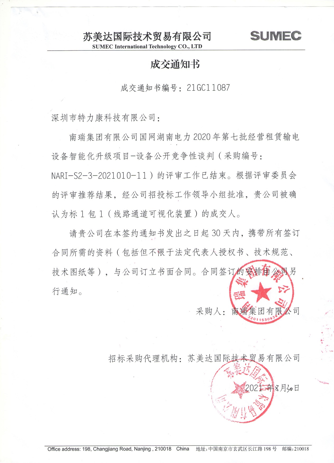 南瑞集團(tuán)有限公司國(guó)網(wǎng)湖南電力2020年第七批經(jīng)營(yíng)租賃輸電設(shè)備智能化升級(jí)項(xiàng)目-設(shè)備公開(kāi)競(jìng)爭(zhēng)性談判(采購(gòu)編號(hào):NARI-S2-3-2021010-11 )的評(píng)審工作已結(jié)束。根據(jù)評(píng)審委員會(huì)的評(píng)審?fù)扑]結(jié)果,經(jīng)公司招投標(biāo)工作領(lǐng)導(dǎo)小組批準(zhǔn),我司被確認(rèn)為標(biāo)1包1 (線路通道可視化裝置)的成交人。中標(biāo)公告如下: