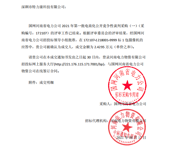 國網(wǎng)河南省電力公司2021年第一批電商化公開競(jìng)爭(zhēng)性談判采購《- -) (果購編號(hào): 172107) 的評(píng)審工作已結(jié)束。根據(jù)評(píng)審委員合的評(píng)審結(jié)果,經(jīng)國網(wǎng)河南省電力公司招投標(biāo)領(lǐng)導(dǎo)小組批準(zhǔn),在7210710101.9999標(biāo)1包攝像機(jī)的應(yīng)答中,責(zé)公司被確認(rèn)為成交人,中標(biāo)通知如下: