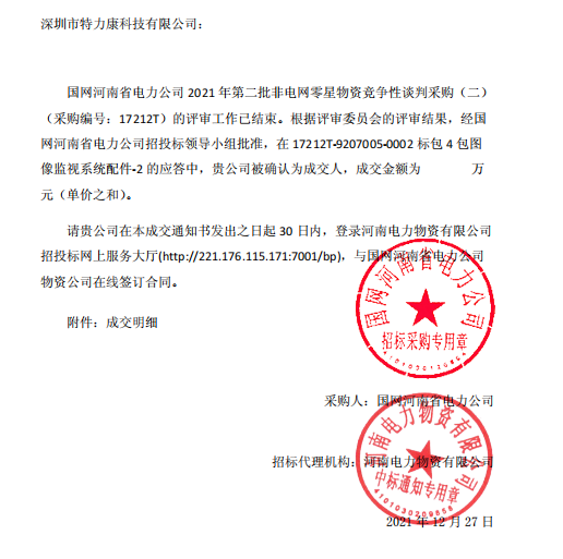 國(guó)網(wǎng)河南省電力公司2021年第二批非電網(wǎng)零星物資競(jìng)爭(zhēng)性談判采購(gòu)(二)(采購(gòu)編號(hào): 17212T) 的評(píng)審工作已結(jié)束。根據(jù)評(píng)審委員會(huì)的評(píng)審結(jié)果。經(jīng)國(guó)網(wǎng)河南省電力公司招投標(biāo)領(lǐng)導(dǎo)小組批準(zhǔn),在172127-9207005-0002標(biāo)包4包圖像監(jiān)視系統(tǒng)配件-2的應(yīng)答中。貴公司被確認(rèn)為成交人,成交通知如下: