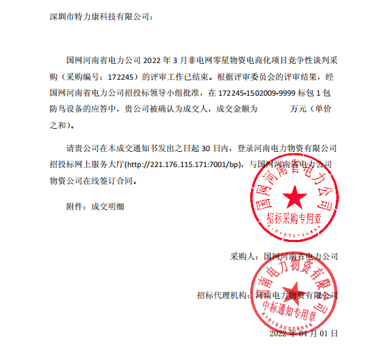 國網(wǎng)河南省電力公司2022年3月非電網(wǎng)零星物資電商化項目競爭性談判采購(采購編號: 172245)的評審工作已結束。根據(jù)評審委員會的評審結果,經(jīng)國網(wǎng)河南省電力公司招投標領導小組批準,在172245-1502009-9999標包1包防鳥設備的應答中,我司被確認為成交人,成交通知如下: